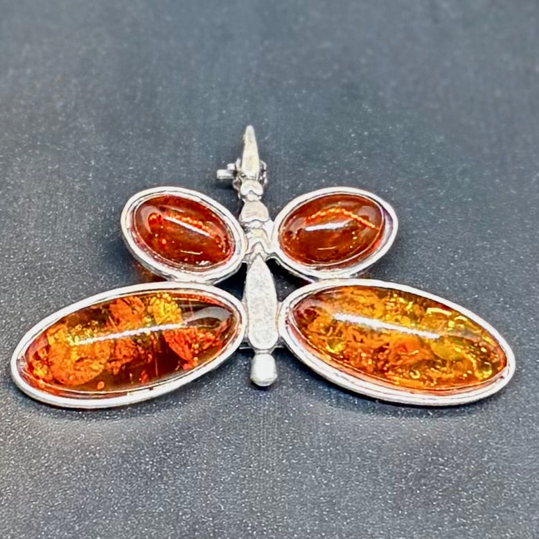 Dekorative Brosche in Schmetterlingsform aus 925er Sterlingsilber, verziert mit vier Cabochons aus echtem baltischem Bernstein in warmen Honig- und Cognactönen. Der Bernstein weist natürliche Einschlüsse und ein wunderschönes Farbenspiel auf, was der Brosche eine lebendige und exklusive Ausstrahlung verleiht.