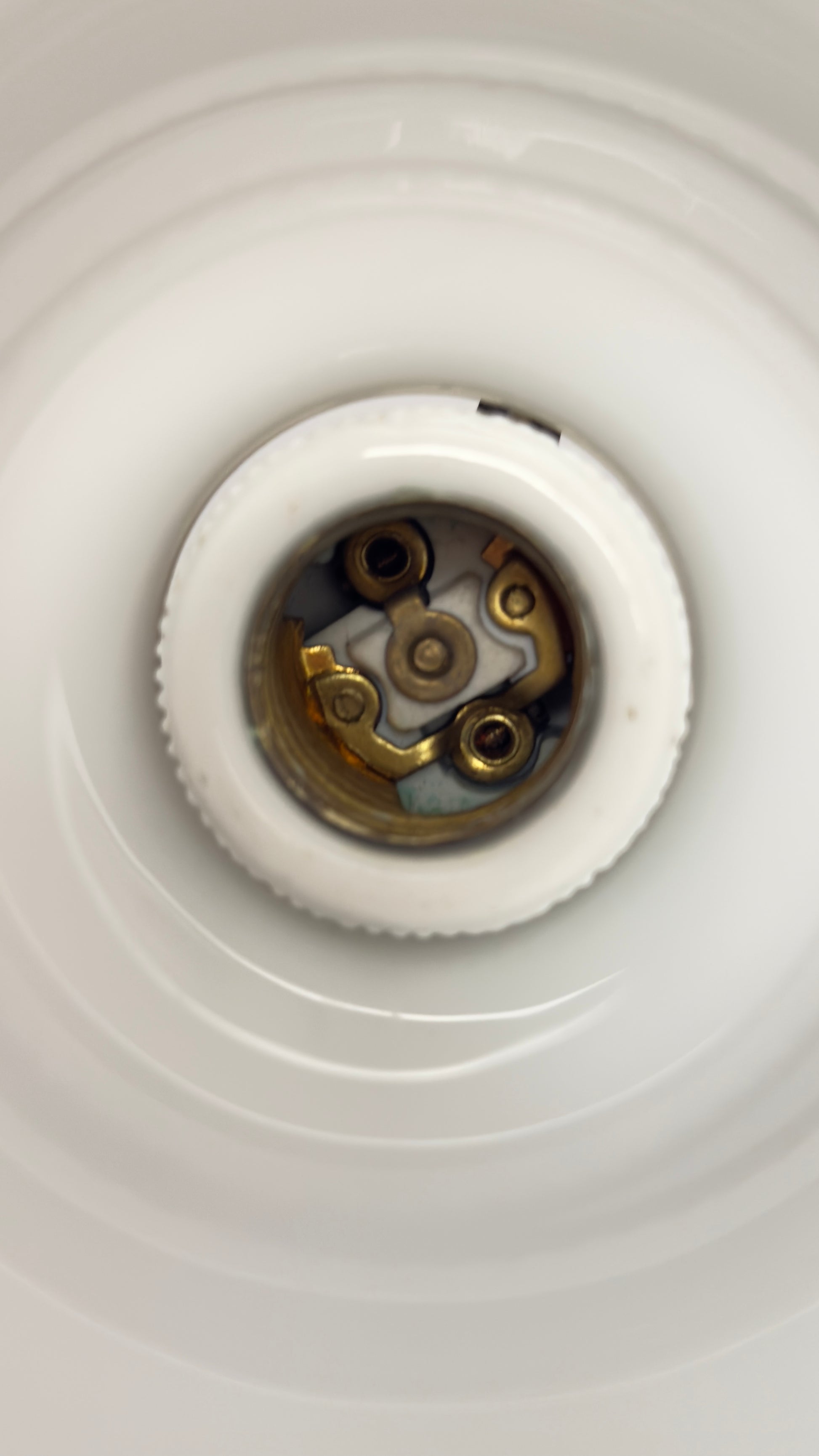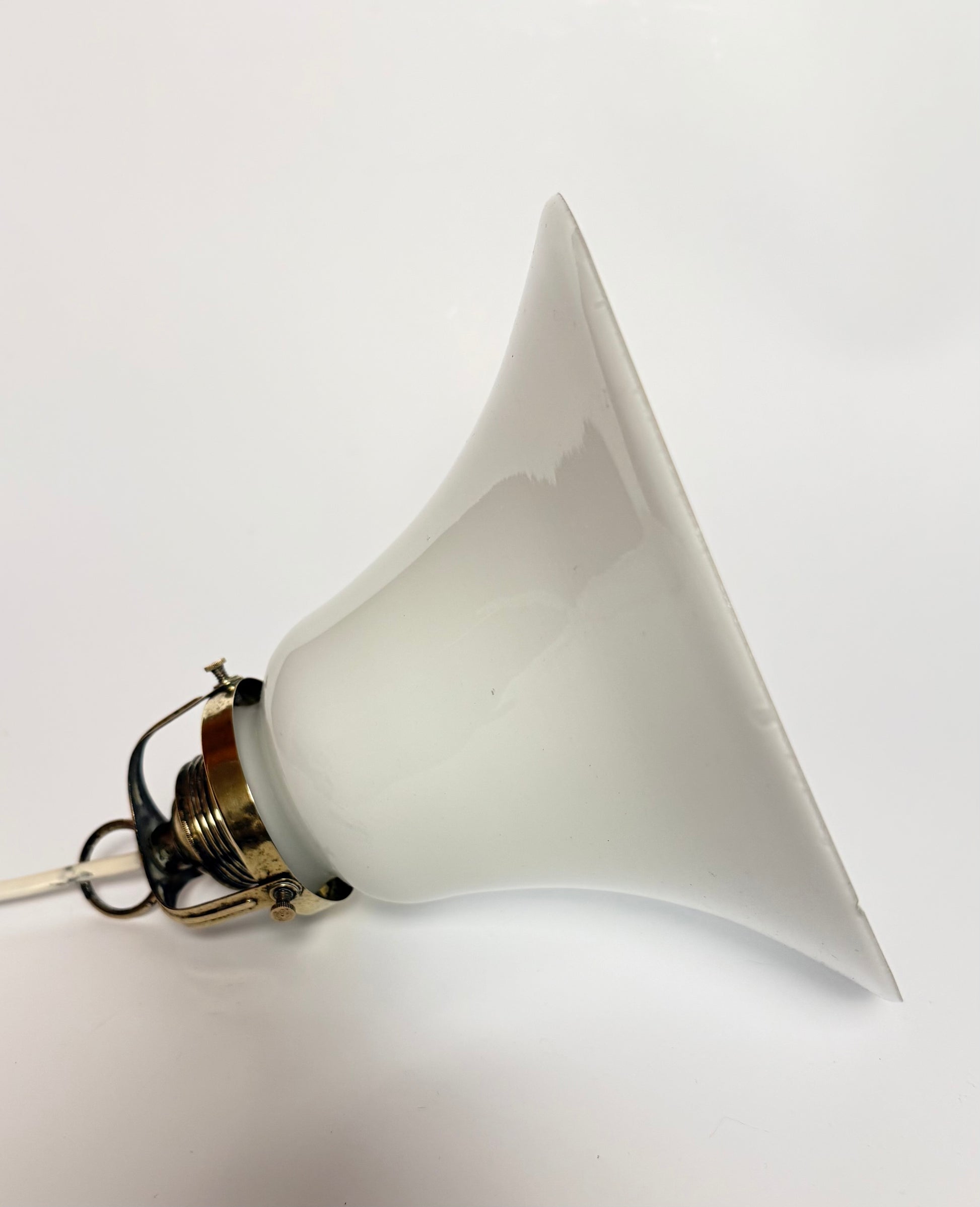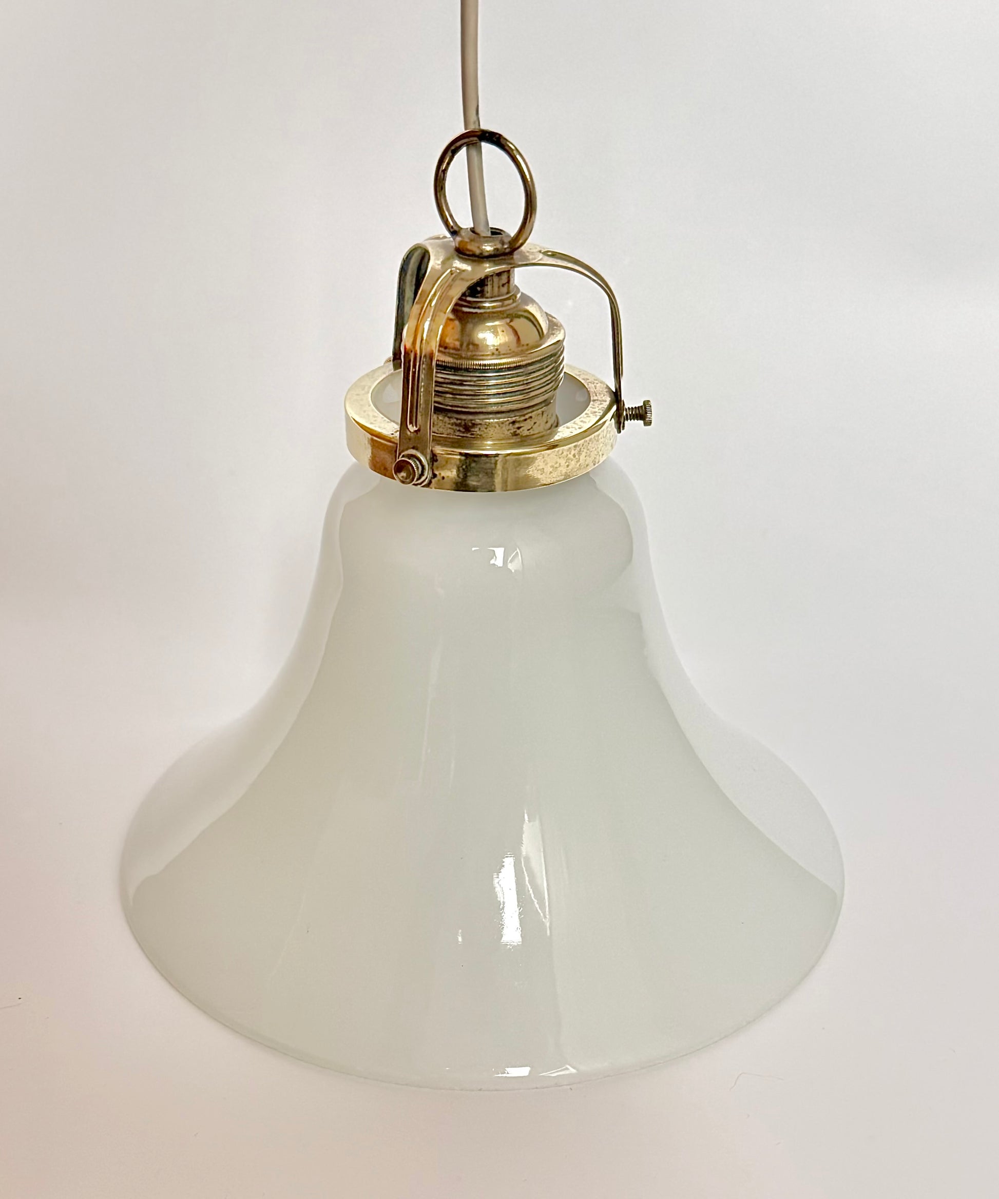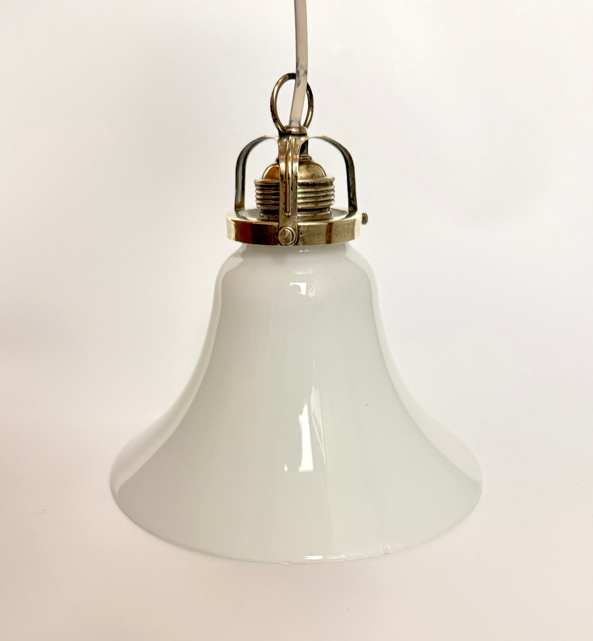 Vintage-Pendelleuchte mit opalweißem Glasschirm in klassischer Trompetenform und Messingaufhängung. Eine stimmungsvolle Lampe aus der ersten Hälfte des 20. Jahrhunderts, die ein sanftes und angenehmes Licht spendet. Die Messingaufhängung weist eine schöne, natürliche Patina auf, die das Alter und den Charakter der Lampe unterstreicht. Das Kabel wirkt neueren Datums. Keramikfassung. Eine charmante Lampe mit deutlichen Gebrauchsspuren, ideal für Küchen, Flure oder kleinere Räume.