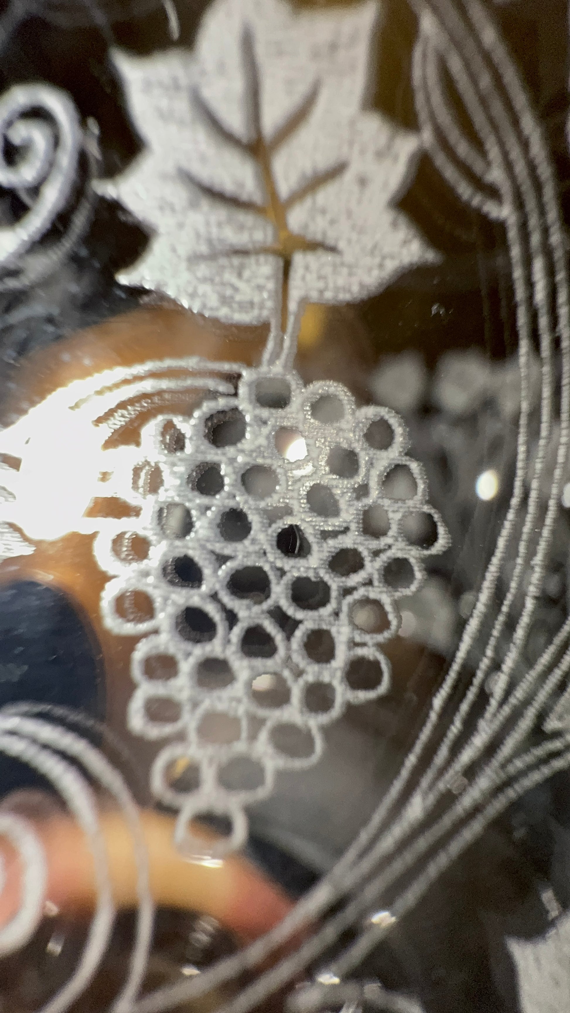 Large red wine glass or beer glass in clear glass with classic Bacchus decoration consisting of vines, leaves and bunches of grapes.