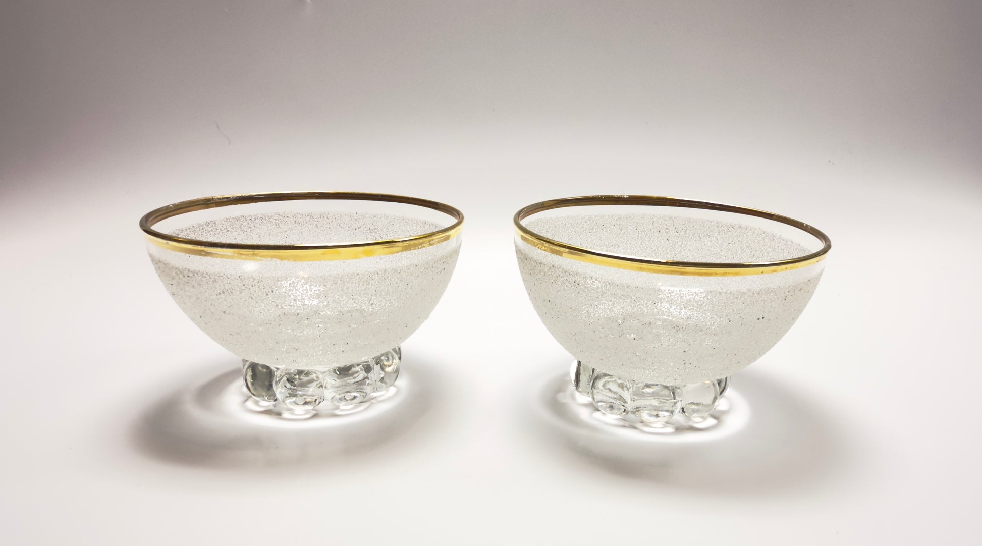 A set of vintage coupe glasses / dessert glasses with rough granulated glass surface and gold rim