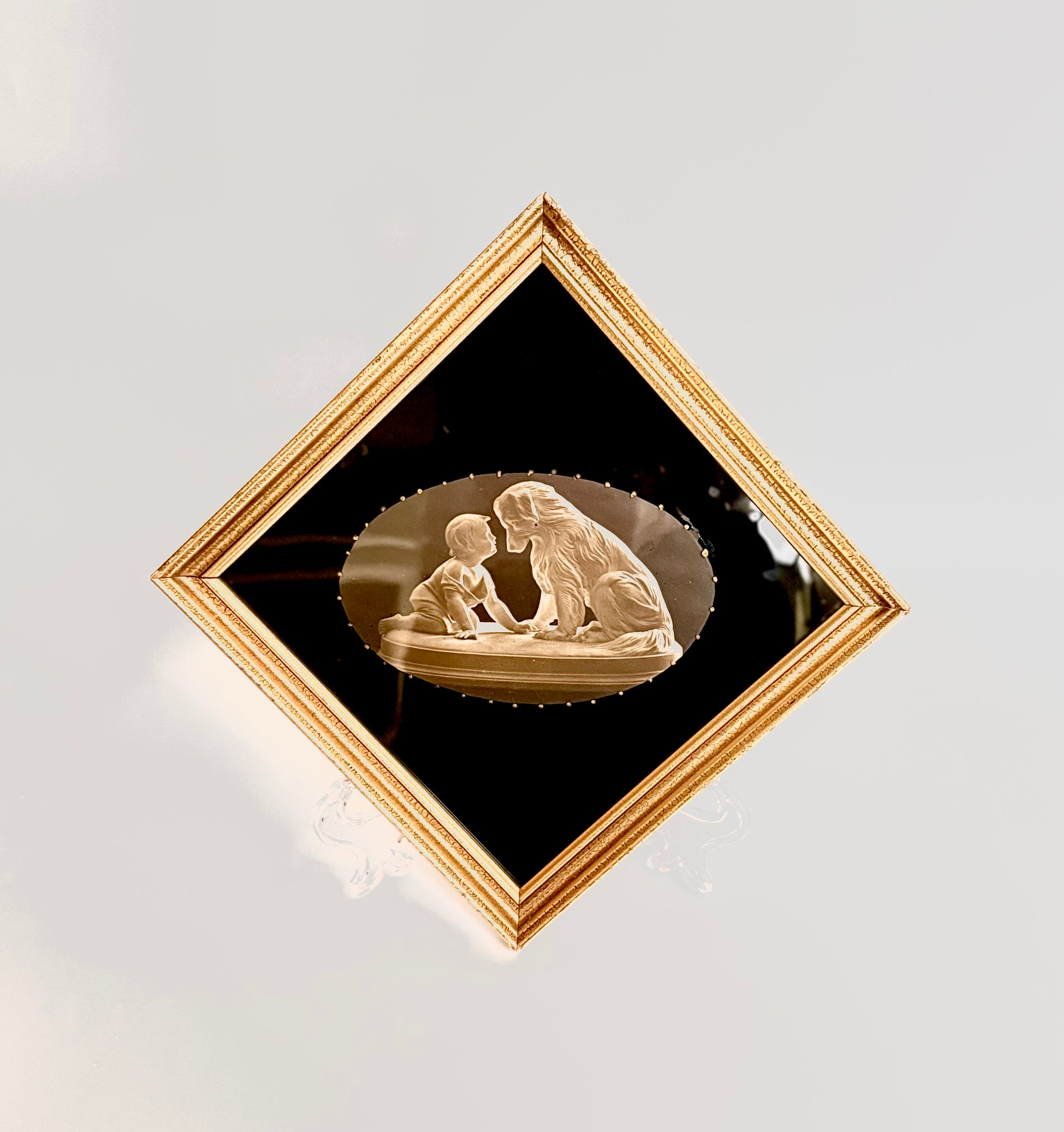 Antikt fotografi med motiv af barn og hund, kendt fra skulpturen “Kan du ikke tale” (“Kan du inte tala”), efter model af prinsesse Eugénie Bernadotte. Motivet var